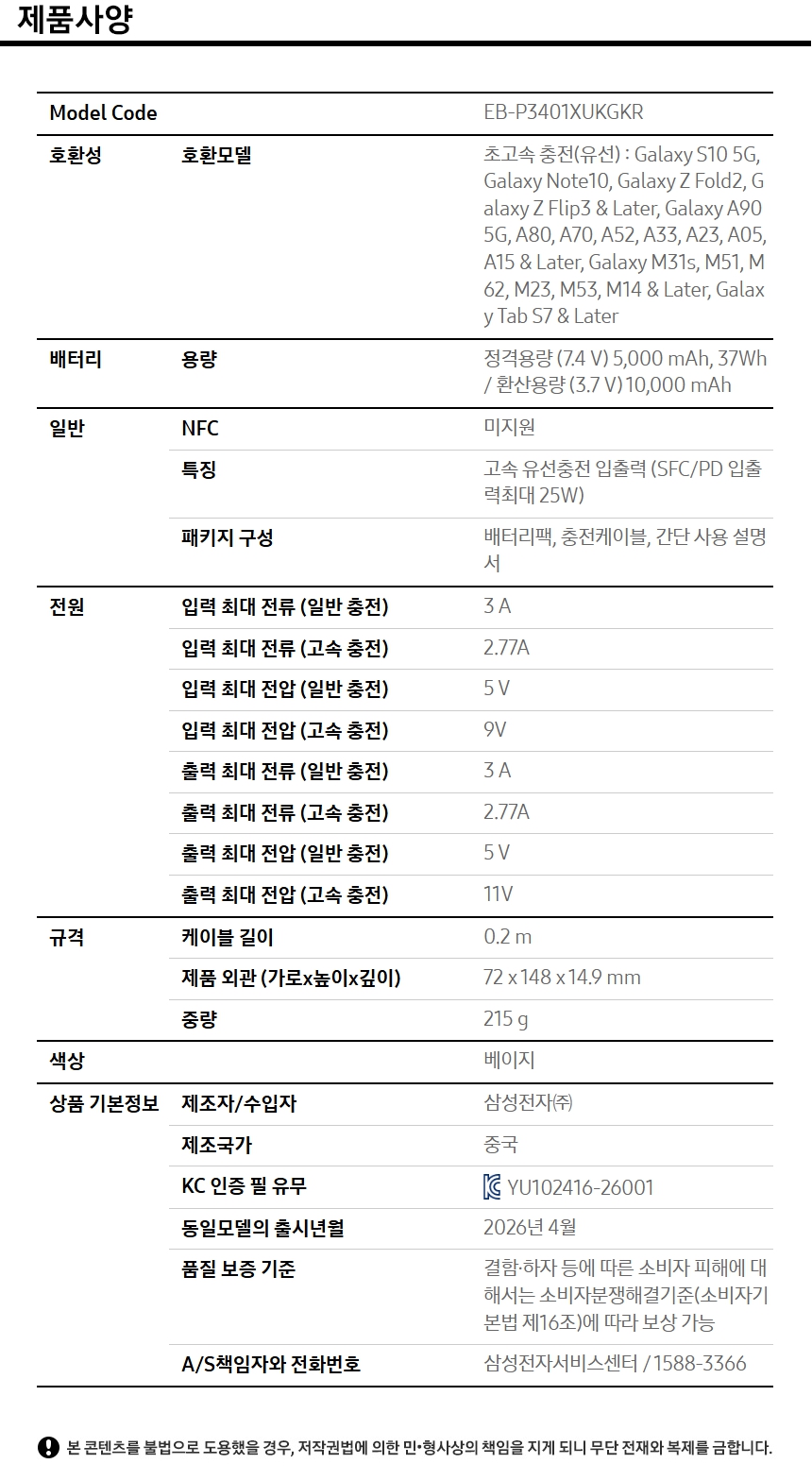 삼성 초고속 대용량 보조배터리 10,000mAh 유선