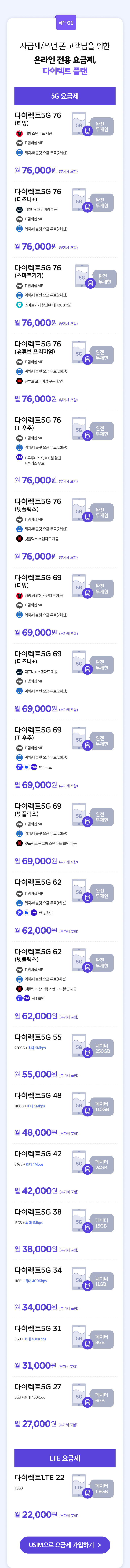 - 다이렉트5G 76(디즈니+) | 월 76,000원(부가세 포함) | 완전 무제한, 디즈니+ 프리미엄 제공, T 멤버십 VIP, 워치/태블릿 요금 무료(2회선)