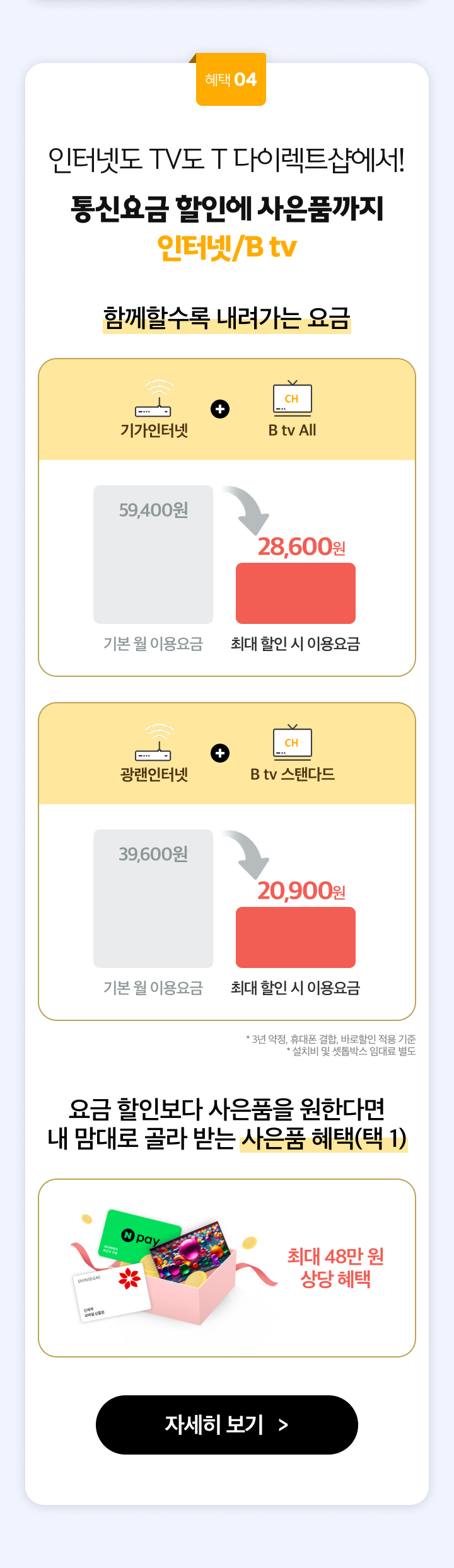 혜택 04. 인터넷도 TV도 T 다이렉트샵에서! 통신요금 할인에 사은품까지 인터넷/Btv