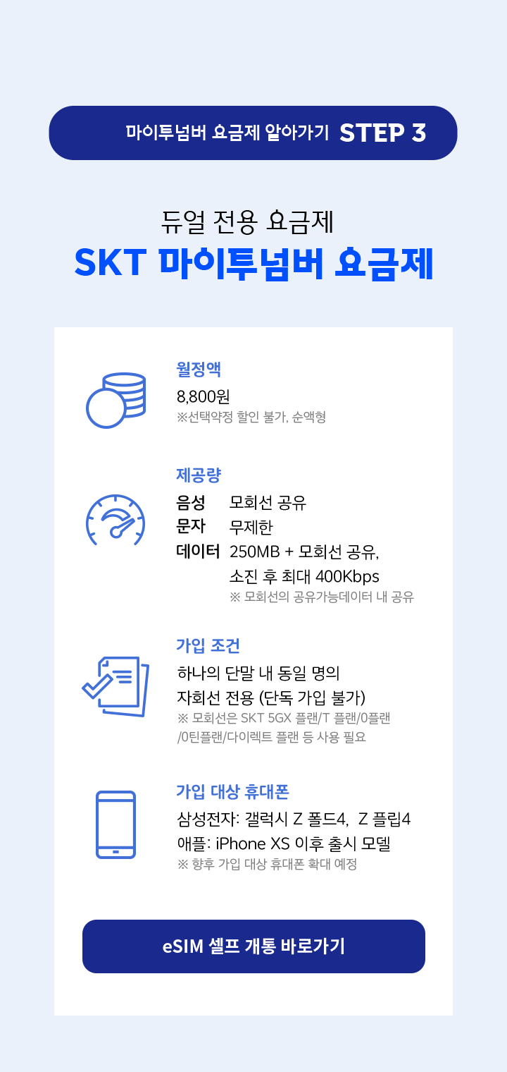 - 가입 조건 : 하나의 단말 내 동일 명의 자회선 전용 (단독 가입 불가) ※ 모회선은 SKT 5GX 플랜/T 플랜/0플랜/0틴플랜/다이렉트 플랜 등 사용 필요