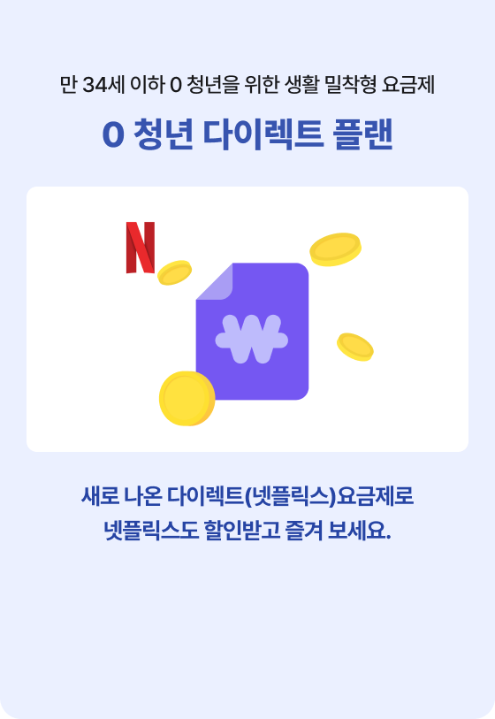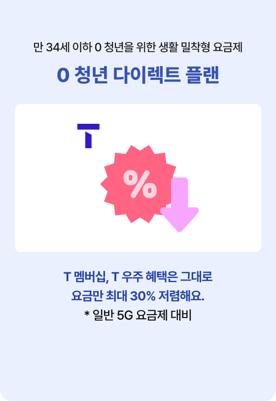 • 0 청년 다이렉트 플랜은 5G 스마트폰을 사용하는 만 34세 이하 고객님만 가입하실 수 있습니다.