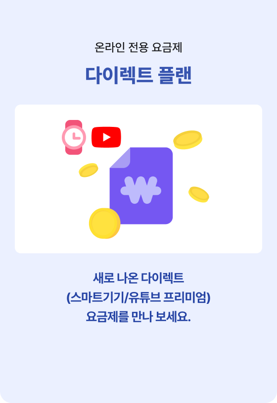 새로 나온 다이렉트(스마트기기/유튜브 프리미엄) 요금제를 만나 보세요.