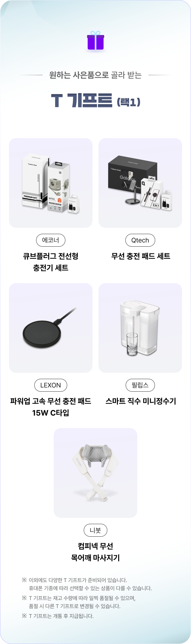 • T 기프트는 재고 수량에 따라 일찍 품절될 수 있으며, 품절 시 다른 T 기프트로 변경될 수 있습니다.
