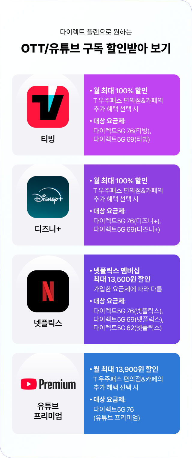 • 대상 요금제: 다이렉트5G 76(티빙), 다이렉트5G 69(티빙)