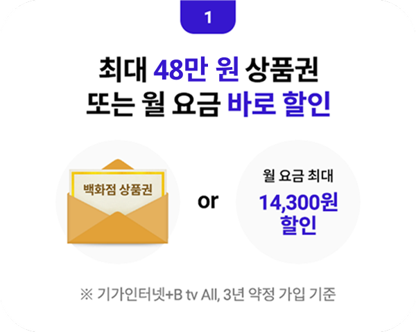 - 요금 할인 내역과 백화점 상품권의 지급액은 가입 상품과 약정 기간에 따라 다르며, 자세한 내용은 가입 상담 시 확인하시기 바랍니다.