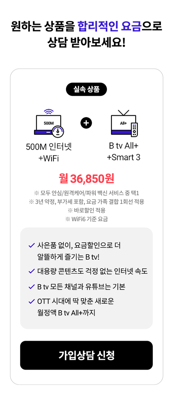 - B tv+ 조합 상품(B tv All+, B tv 스탠다드+) 에서 타 상품으로 변경 시 6개월 간 B tv+ 조합 상품으로 재가입이 어렵습니다.
