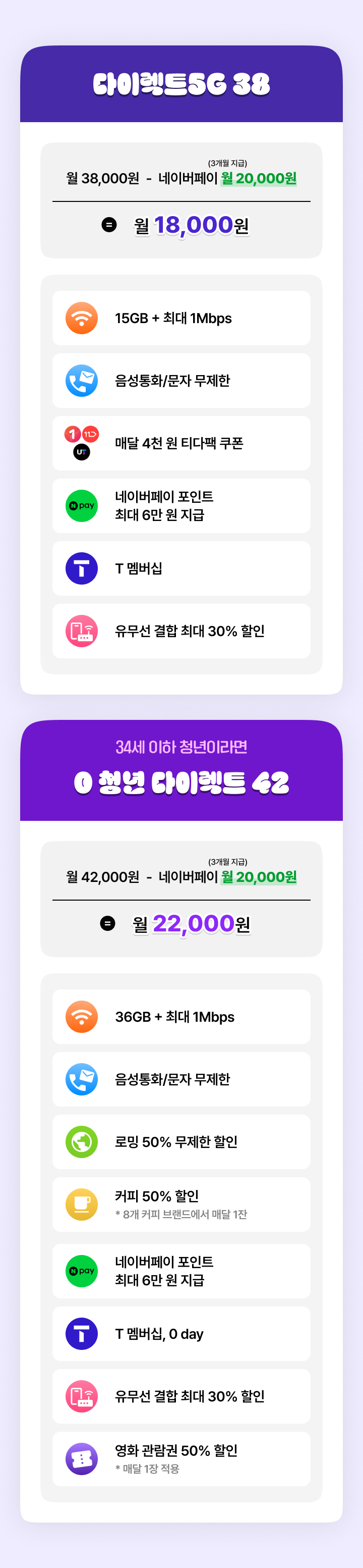 0 청년 다이렉트 42 월 42,000원36GB + 최대 1Mbps네이버페이 포인트 총 6만 원 (월 2만 원, 3개월)