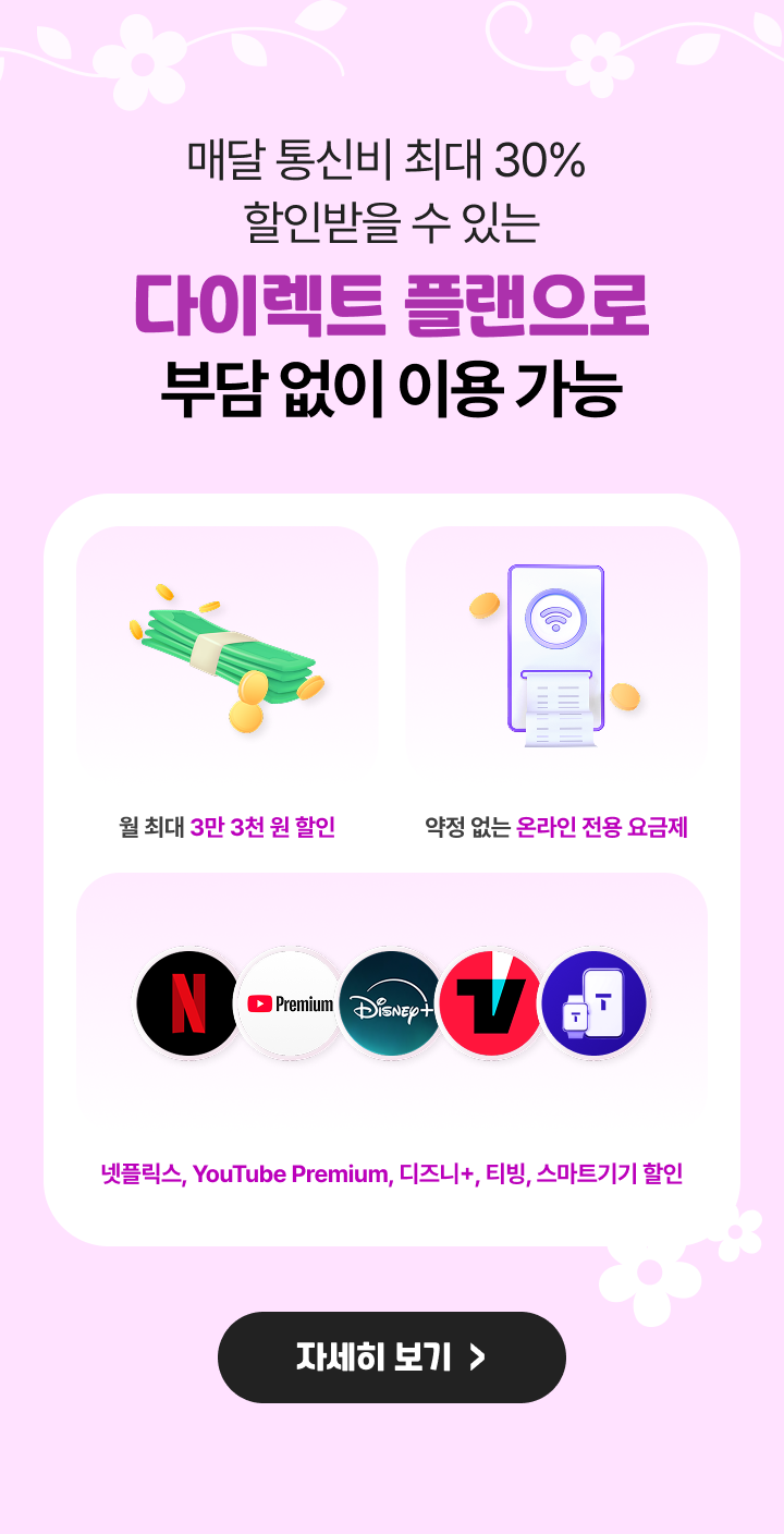 매달 통신비 최대 30% 할인받을 수 있는 다이렉트 플랜으로 부담 없이 이용 가능