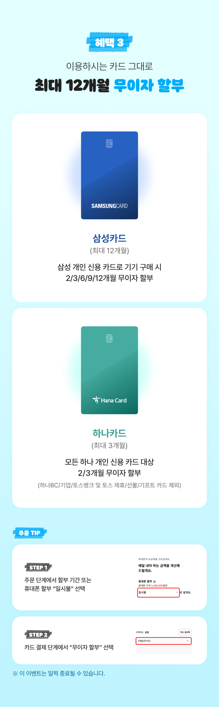 - 삼성 개인 신용 카드로 기기 구매 시 2/3/6/9/12개월 무이자 할부