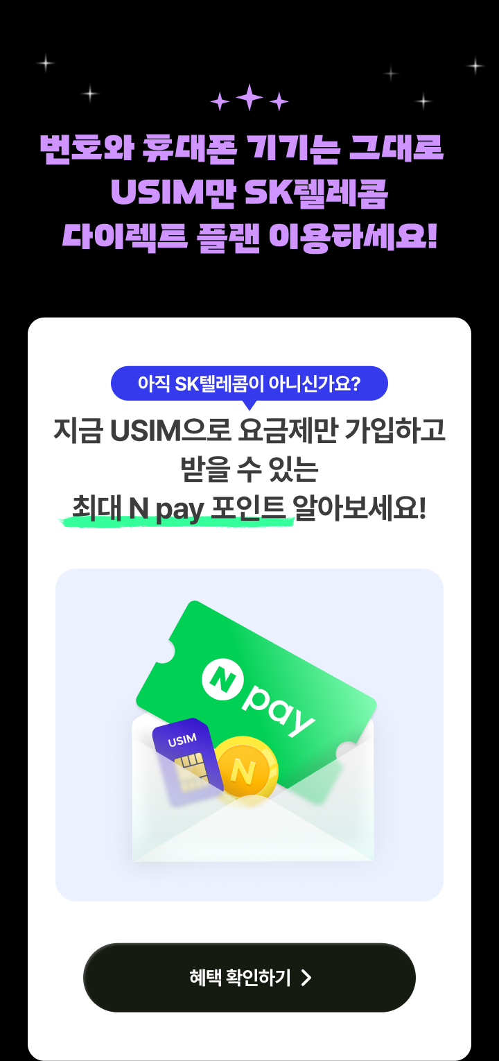 지금 USIM으로 요금제만 가입하고 받을 수 있는 최대 N pay 포인트 알아보세요!