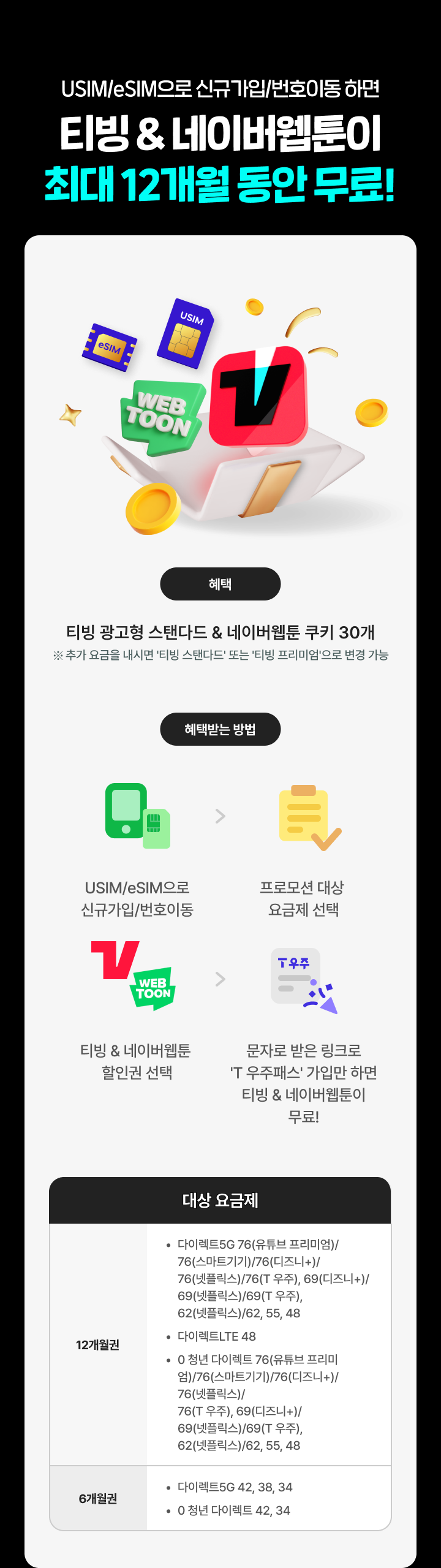 USIM/eSIM으로 신규가입/번호이동하면 티빙 & 네이버웹툰이 최대 12개월 동안 무료!