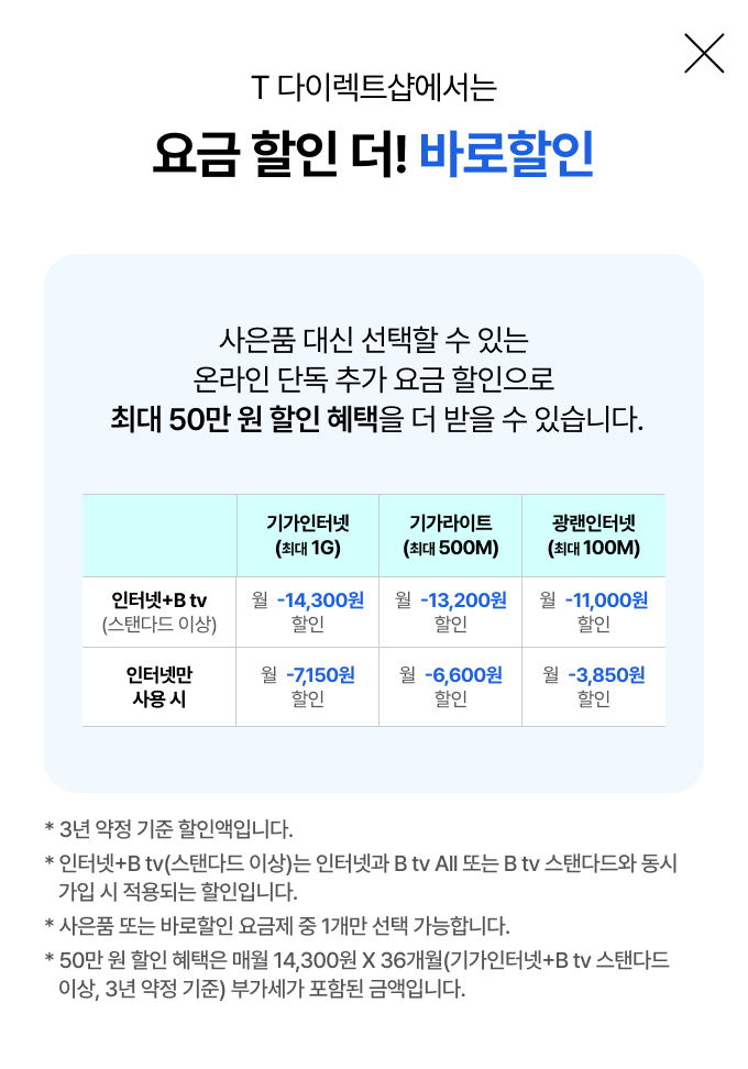 • 바로할인 선택 시, 별도 사은품은 제공되지 않습니다.(36개월간 제공, 기간 종료 후 재약정 시 동시 할인 사용 가능)