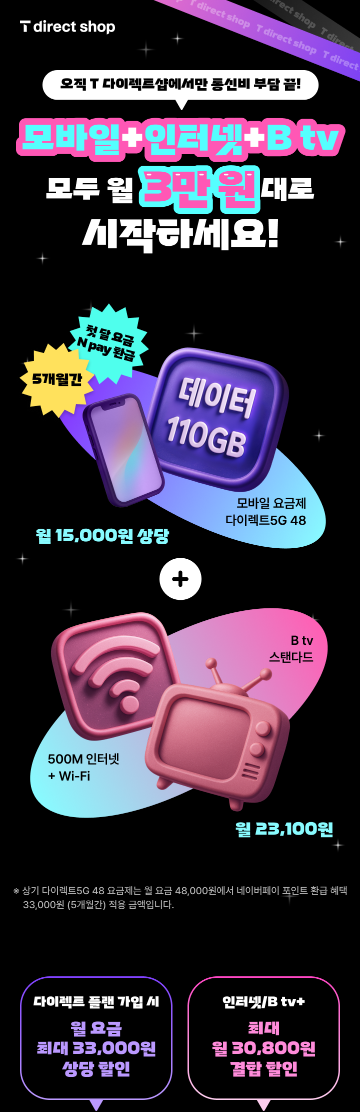 모바일+인터넷+B tv 모두 월 3만 원대로 시작하세요!