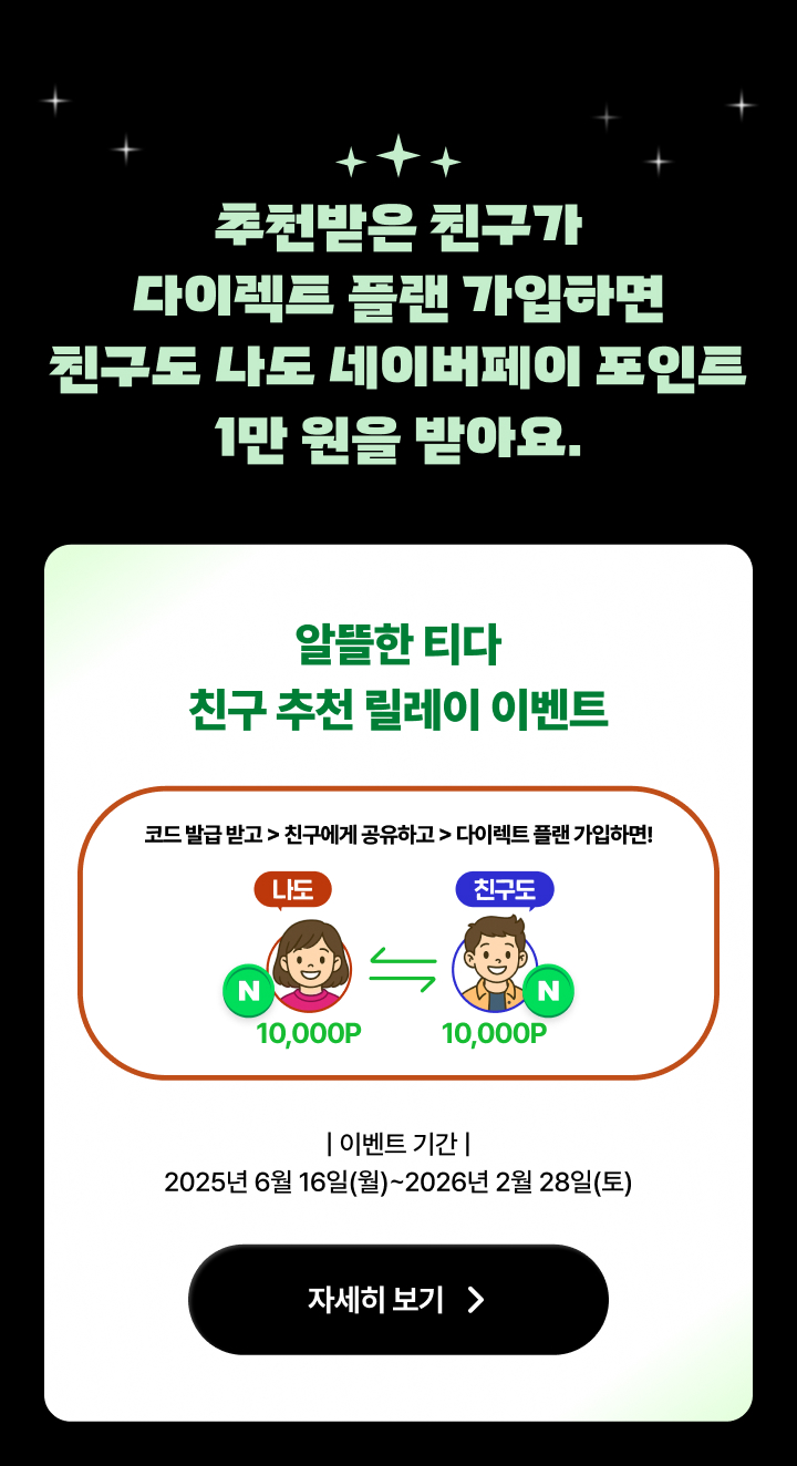 추천받은 친구가 다이렉트 플랜 가입하면 친구도 나도 네이버페이 포인트 1만 원을 받아요.