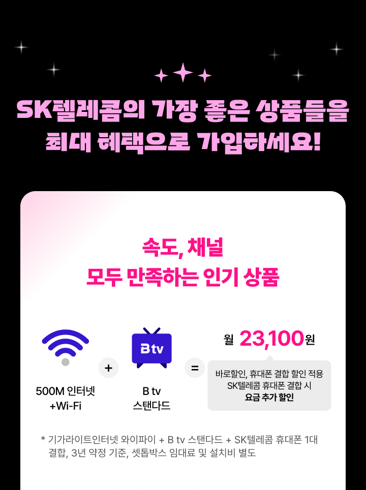 * 기가라이트인터넷 와이파이 + B tv 스탠다드 + SK텔레콤 휴대폰 1대 결합, 3년 약정 기준, 셋톱박스 임대료 및 설치비 별도