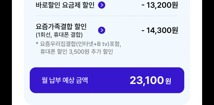 • = 월 23,100원 바로할인, 휴대폰 결합 할인 적용 SK텔레콤 휴대폰 결합 시 요금 추가 할인