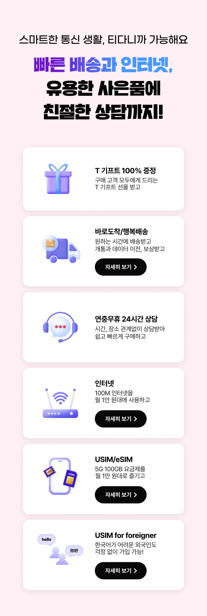 - 대상: T 다이렉트샵에서 신규가입/기기변경하여 티다팩 대상 요금제에 가입하신 고객님