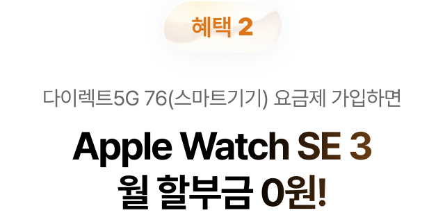 혜택 2 다이렉트5G 76(스마트기기) 요금제 가입하면 Apple Watch SE 3 월 할부금 0원!