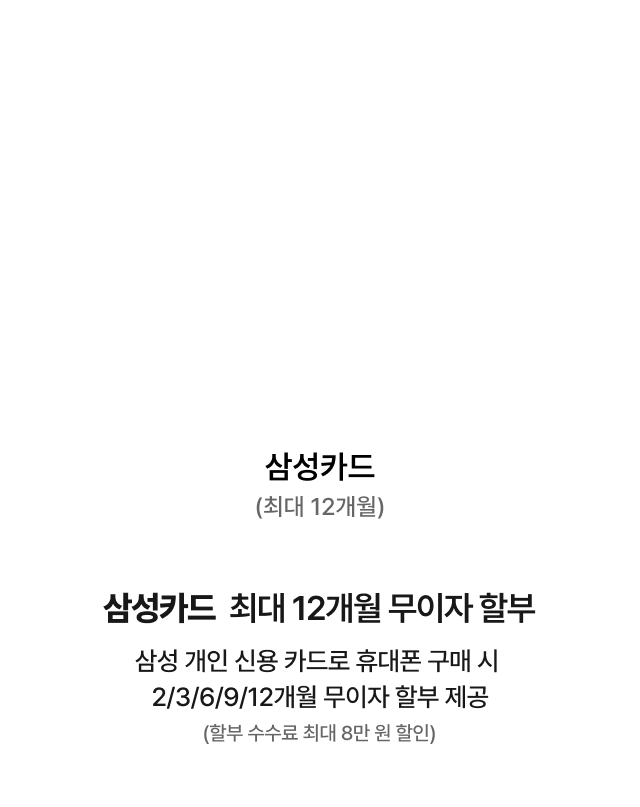 삼성 개인 신용 카드로 휴대폰 구매 시 2/3/6/9/12개월 무이자 할부 제공 (할부 수수료 최대 8만 원 할인)