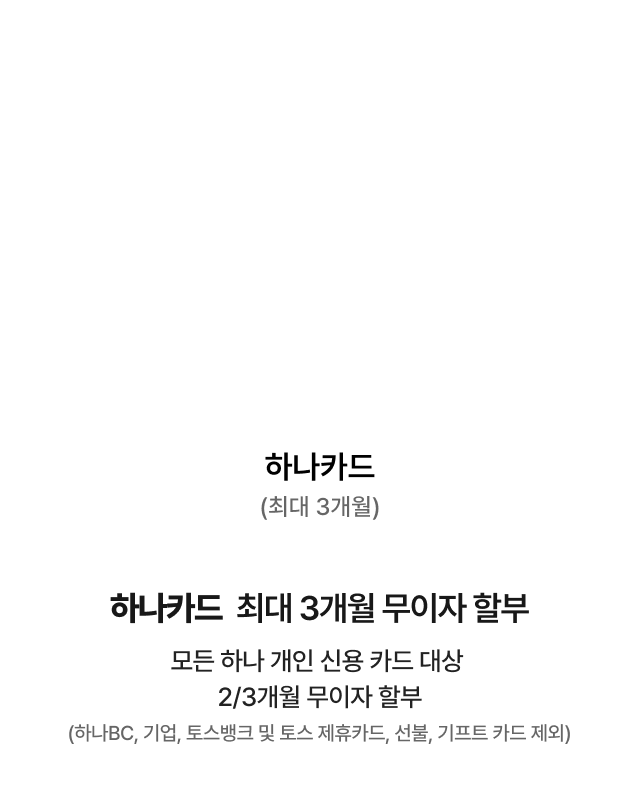 모든 하나 개인 신용 카드 대상 2/3개월 무이자 할부 (하나BC, 기업, 토스뱅크 및 토스 제휴카드, 선불, 기프트 카드 제외)