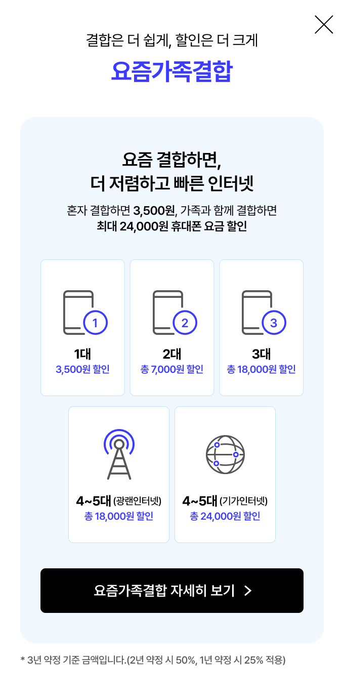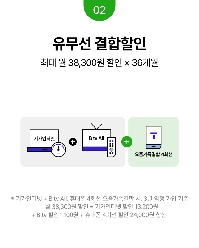 유무선 결합할인 최대 월 38,300원 할인 × 36개월 ※ 기가인터넷 + B tv All, 휴대폰 4회선 요즘가족결합 시, 3년 약정 가입 기준 월 38,300원 할인 = 기가인터넷 할인 13,200원 + B tv 할인 1,100원 + 휴대폰 4회선 할인 24,000원 합산