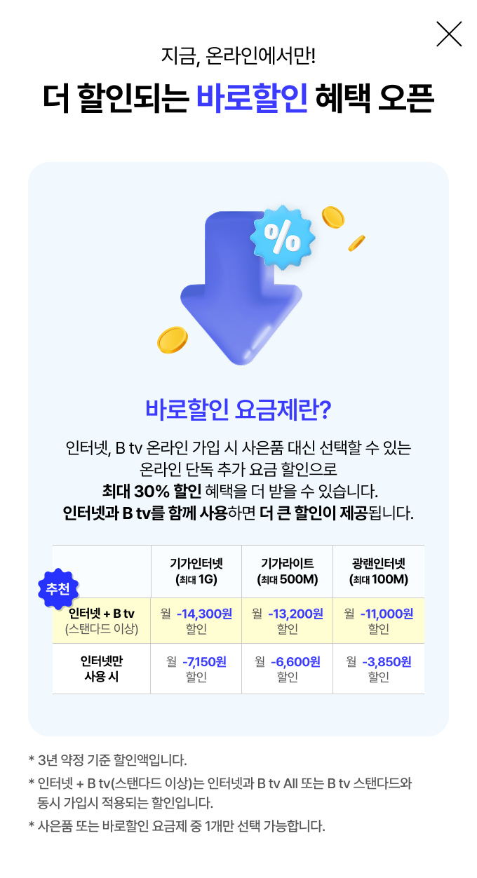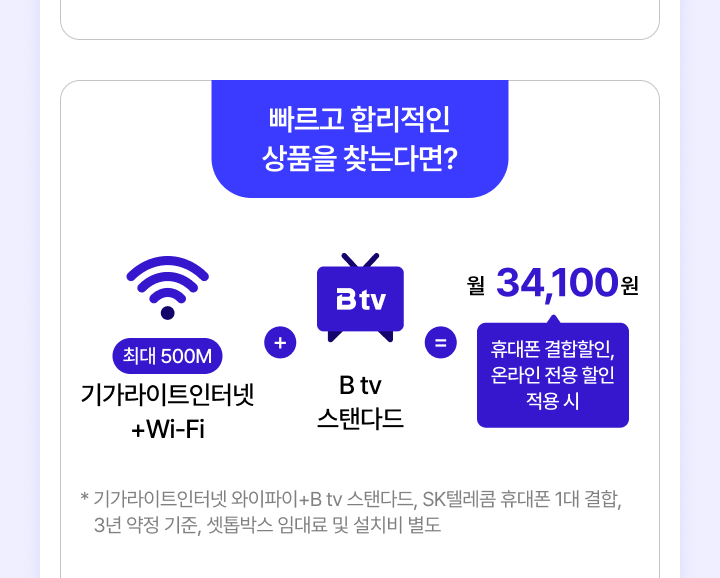 {최대 500M 기가라이트인터넷+Wi-Fi} + {B tv 스탠다드} = 월 34,100원(휴대폰 결합할인, 온라인 전용 할인 적용 시)