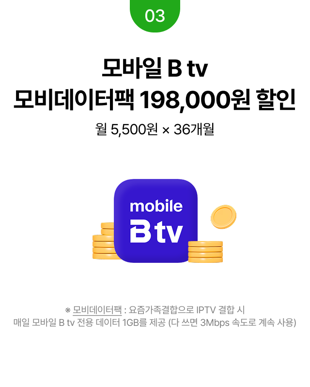 모바일 B tv 모비데이터팩 198,000원 할인 월 5,500원 × 36개월 ※ 모비데이터팩 : 요즘가족결합으로 IPTV 결합 시 매일 모바일 B tv 전용 데이터 1GB를 제공 (다 쓰면 3Mbps 속도로 계속 사용)