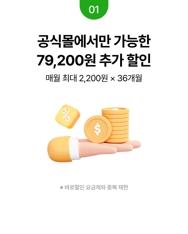 공식몰에서만 가능한 79,200원 추가 할인 매월 최대 2,200원 × 36개월 ※ 바로할인 요금제와 중복 제한