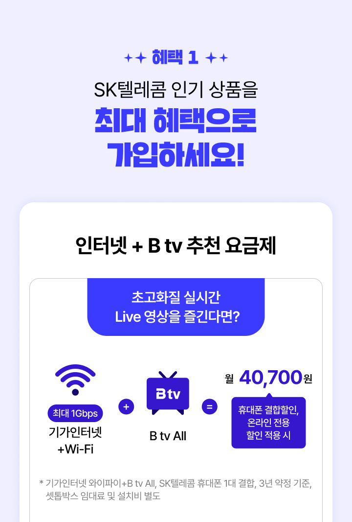 • * 기가인터넷 와이파이+B tv All, SK텔레콤 휴대폰 1대 결합, 3년 약정 기준, 셋톱박스 임대료 및 설치비 별도