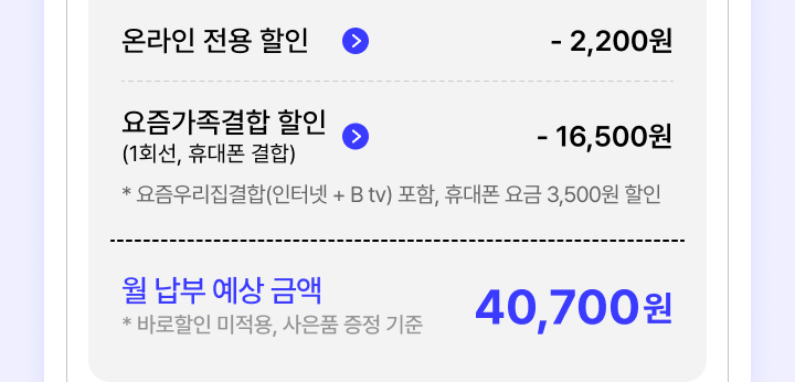 * 상기 혜택 2는 '온라인 가입, 기가인터넷, B tv All+, 휴대폰 4회선 요즘가족결합' 선택 시 할인되는 최대 금액입니다.