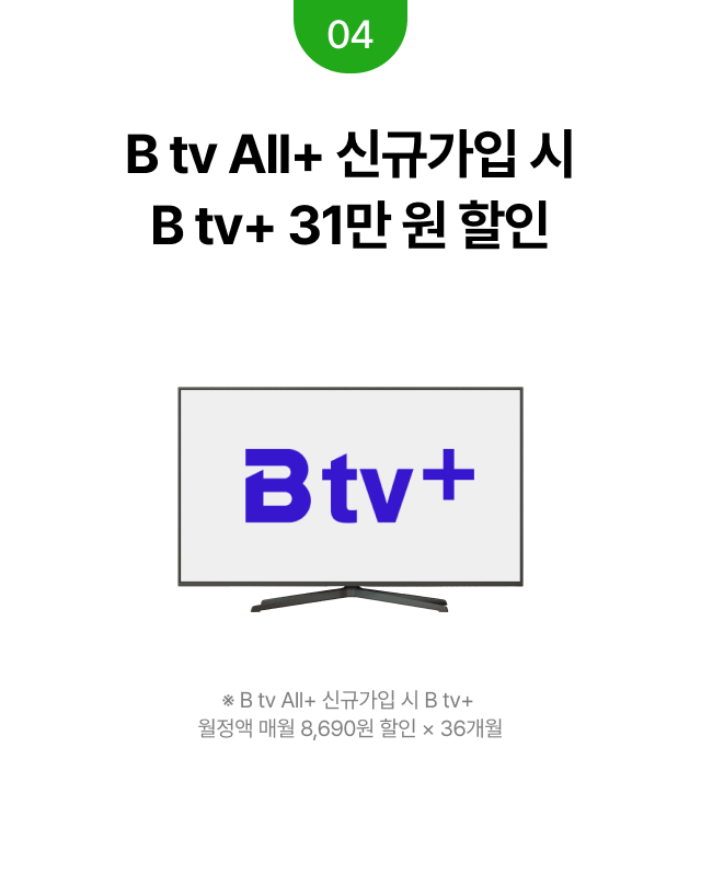 B tv All+ 신규가입 시 B tv+ 31만 원 할인 ※ B tv All+ 신규가입 시 B tv+ 월정액 매월 8,690원 할인 × 36개월