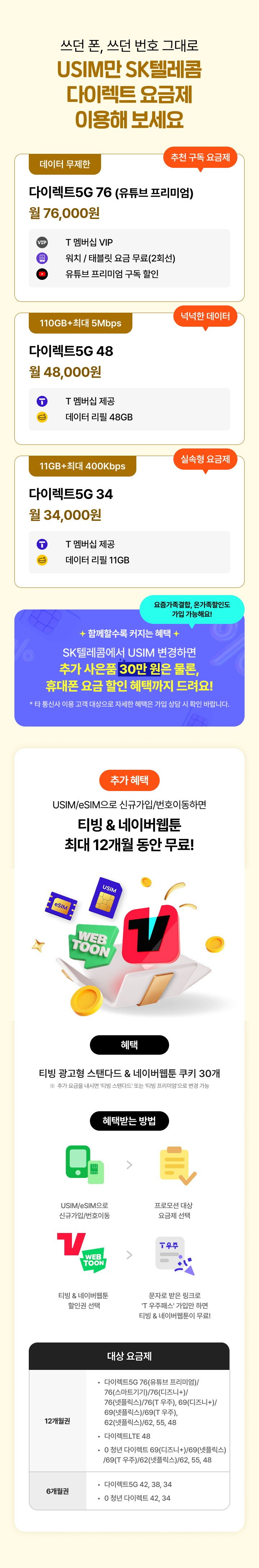 [추가 혜택] USIM/eSIM으로 신규가입/번호이동하면 티빙 & 네이버웹툰 최대 12개월 동안 무료!