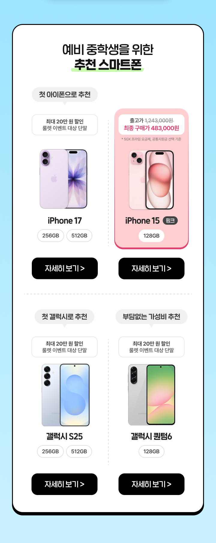 - 아이폰 15 128GB, 아이폰 16, 17 시리즈(아이폰 16e 포함), 갤럭시 S25 시리즈(갤럭시 S25 엣지, 갤럭시 S25 FE 포함), 갤럭시 Z 폴드7, 갤럭시 Z 플립7(갤럭시 Z 플립7 FE 포함), 갤럭시 Z 폴드6, 갤럭시 Z 플립6, 갤럭시 퀀텀6, 갤럭시 S24 FE