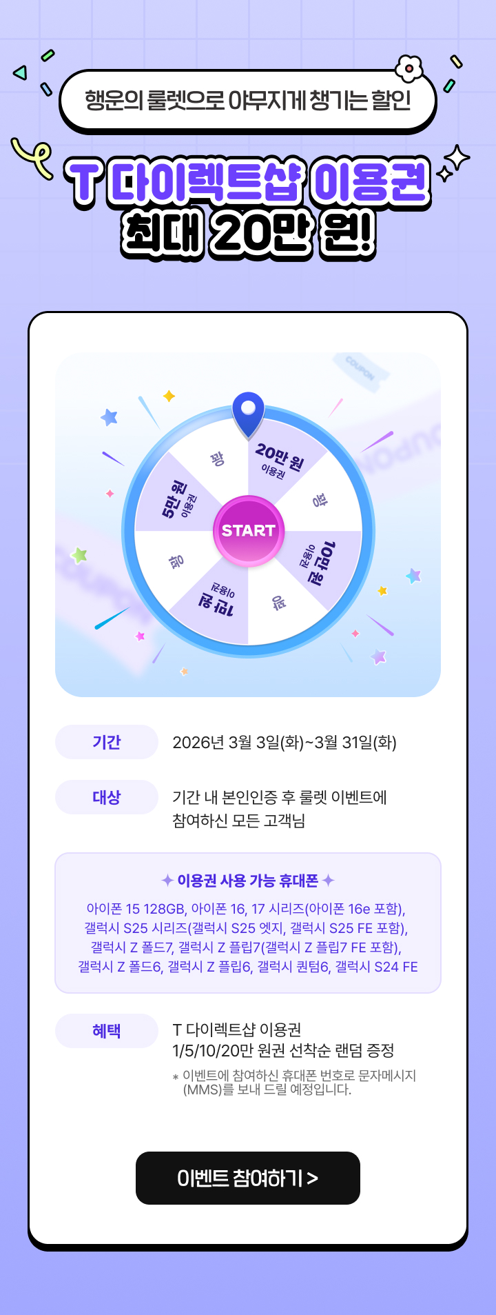 - T 다이렉트샵 이용권 1/5/10/20만 원권 선착순 랜덤 증정 * 이벤트에 참여하신 휴대폰 번호로 문자메시지(MMS)를 보내 드릴 예정입니다.