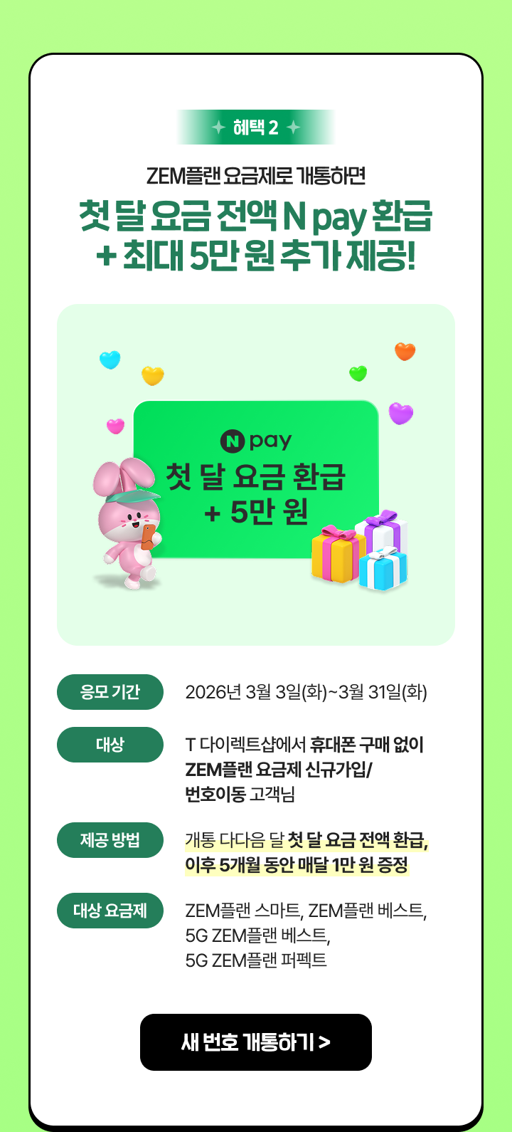 혜택 2. ZEM플랜 요금제로 개통하면 첫 달 요금 전액 N pay 환급 + 최대 5만 원 추가 제공!