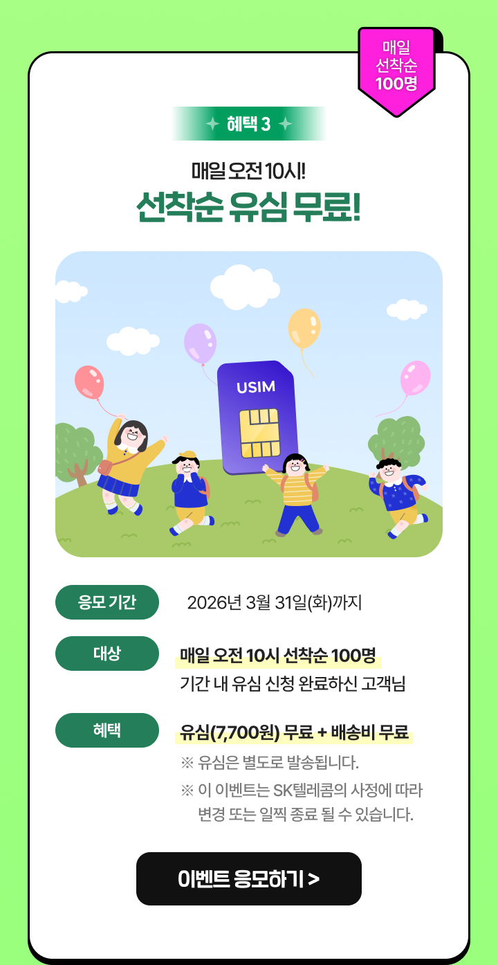 - 매일 오전 10시 선착순 100명 기간 내 유심 신청 완료하신 고객님