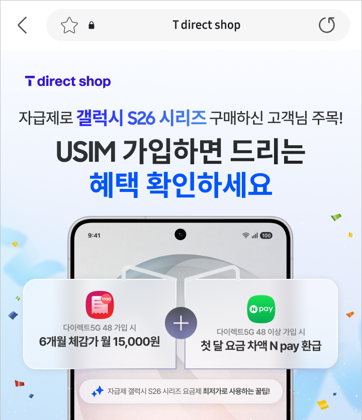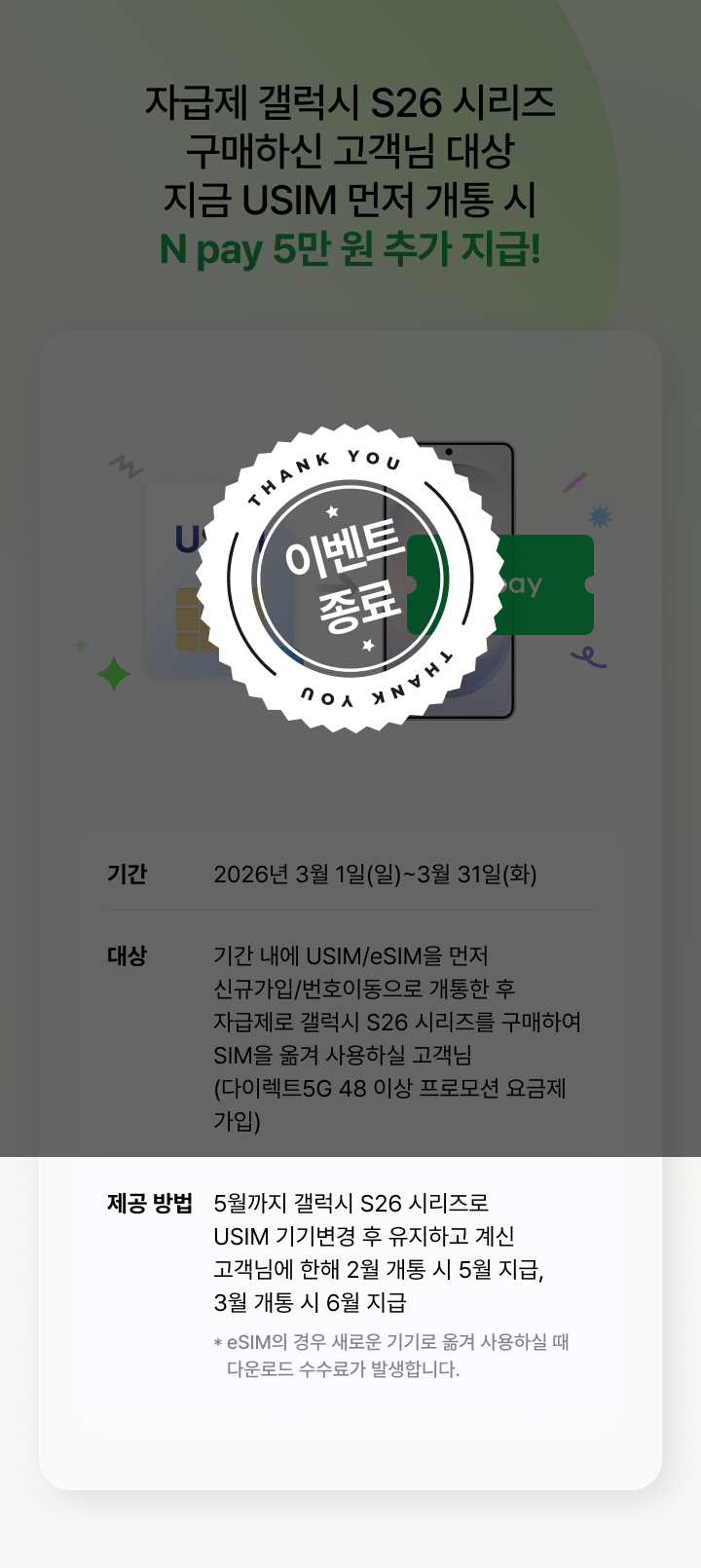 (이벤트 종료) 자급제로 갤럭시 S26 시리즈 구매하신 고객님 대상 지금 USIM 먼저 개통 시 N pay 5만 원 추가 지급!