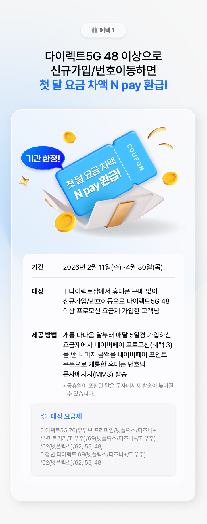 혜택 1) 다이렉트5G 48 이상으로 신규가입/번호이동하면 첫 달 요금 차액 N pay 환급!
