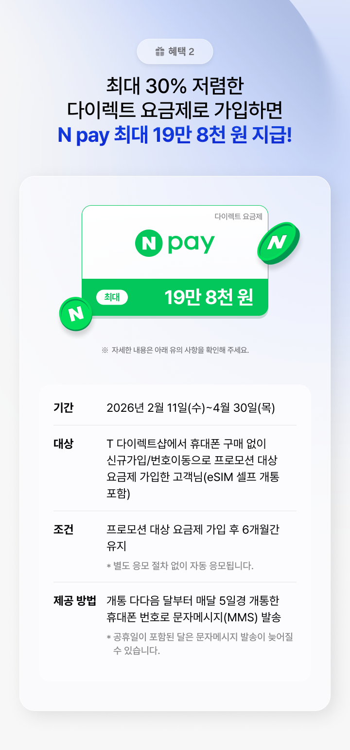 혜택 2) 최대 30% 저렴한 다이렉트 요금제로 가입하면 N pay 최대 19만 8천 원 지급!