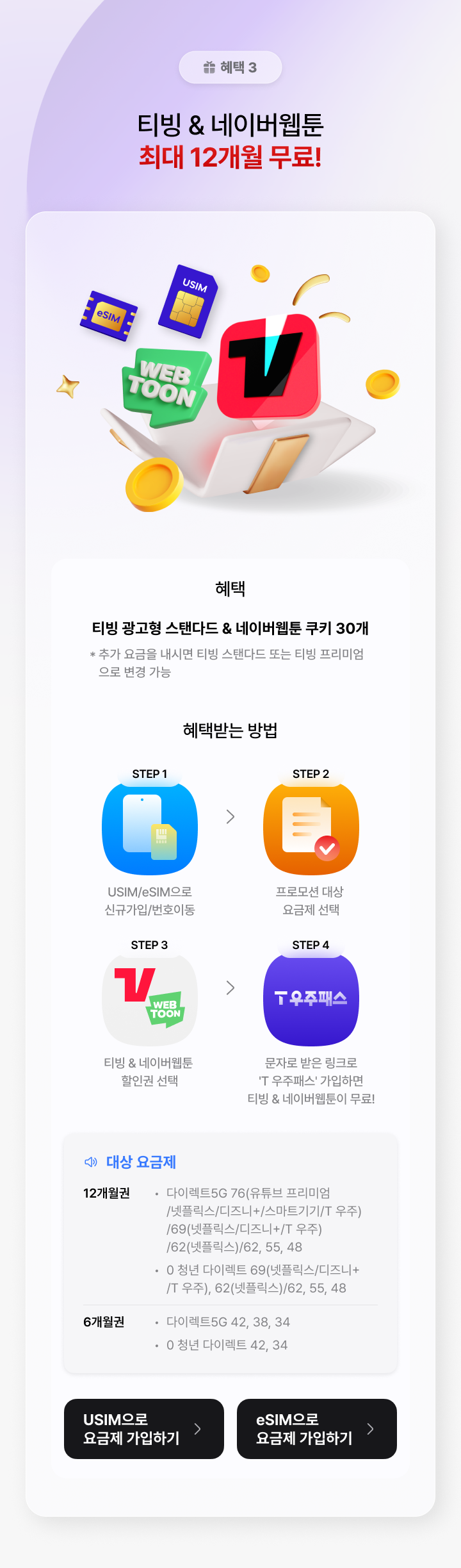 • 본 혜택은 <T 우주패스 티빙 & 네이버웹툰> 상품을 통해 제공됩니다.